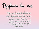 Today my boyfriend asked me what dysphoria looked like to me. I honestly didn’t know how to answer it, because I try to suppress it, so I’m not very good at listening to myself, and I’m not good with words. I forget things, I lie or change subject.