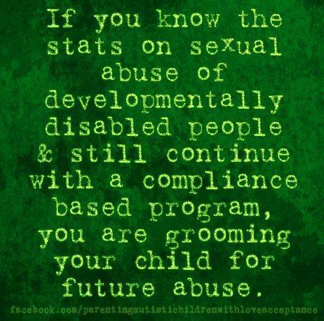 “Compliance based therapies such as ABA leave Autistic adults and children vulnerable to abuse and exploitation.”“More than ninety percent (90%) of people (both male and female) with developmental disabilities will experience sexual abuse at some point in their lives. Forty-nine percent (49%) will experience ten or more abuse incidents. (Valenti-Hein, D. & Schwartz, L. (1995). The Sexual Abuse …Interview for Those with Developmental Disabilities. James Stanfield Company. Santa Barbara: California)”