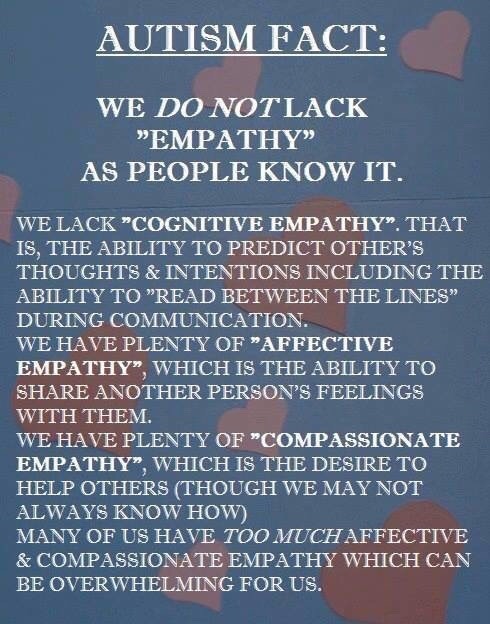 this is a really important message because it is a common misconception about autism, but it’s also important to acknowledge that people who have conditions that involve less of the other types of empathy are also important and are no less human because often times people try to dehumanize us (autistic people) by saying we don’t have empathy, and it is important to correct their misconception, but it is also important to assert that people who don’t have other kinds of empathy are just as important and valuable as those who do.