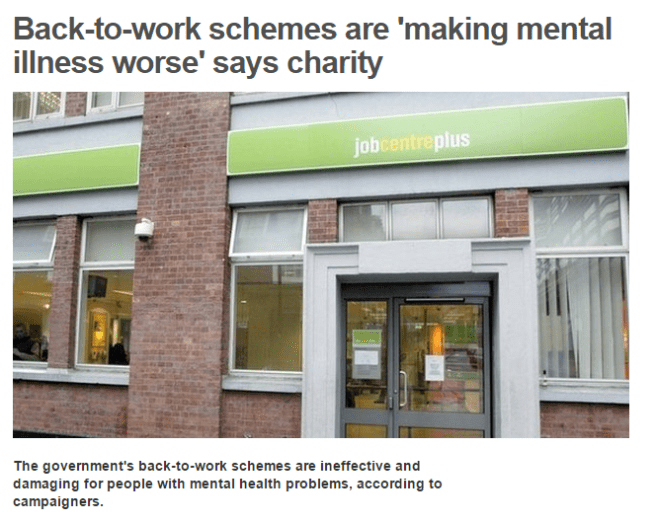 WHO COULD HAVE GUESSED THAT STRESSING OUT A GROUP OF MENTALLY ILL PEOPLE, MAKING THEM JUMP THROUGH A LOAD OF HOOPS TO GET THE BASIC MINIMUM OF SUPPORT, AND THREATEN TO STOP THEIR BENEFITS AND THEREFORE STARVE THEM – IS BAD FOR THEIR MENTAL HEALTH?!