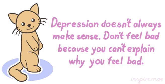 March 14, 2015December 8, 2018 ~ Sephira inspiremoe: Depression doesn’t always make sense. Don’t feel bad because you can’t explain why you feel bad. Share this: Share on X (Opens in new window) X Share on Facebook (Opens in new window) Facebook Like Loading... Related