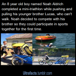 Noah completed a mini-triathlon in Boise, Idaho, all while alternately pushing and pulling Lucas, who, as a result of a rare genetic condition, cannot walk, talk or eat on his own. The duo finished in a time just over 54 minutes. And while Lucas had a smile on his face for hours afterward, many adults at the finish line couldn’t contain their tears.
