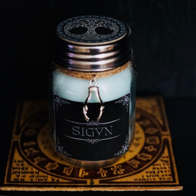 Our Sigyn Candle is the newest addition to the Devotional Mason Jar Collection. Coming in a soft baby blue and generously scented with Juniper berry and sweet pea.