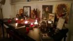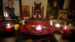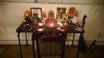 Halloween theme for Loki. I made the blood candles myself. Loki wanted the caramels left there all night! The cup is warm milk, garnished with black pepper, cloves, and mint. Loki’s recipe, but I must say, it was delicious. That fish sculpture next to Sigyn’s bowl is the ugliest damn thing I’ve ever seen. I was like, ‘let’s buy sparkly glass ornaments for your table!’ and Loki was like, ‘nope. fish.’ So now I’m using it to hold a candle for Sigyn, which feels oddly intimate.