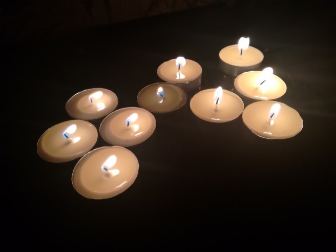 The center candle is for Loki. I find it deeply and inappropriately amusing that his is the lowest flame.