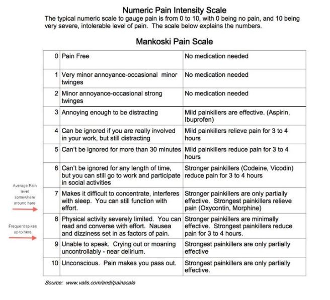 6 – Can’t be ignored for any length of time, but you can still go to work and participate in social activities. Stronger painkillers (Codeine, narcotics) reduce pain for 3-4 hours.