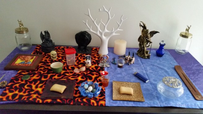A photo of my altar setup. I made an offering of black tea and fruit-filled biscuits for Hela and Loki today (the tea doesn’t look black, in the photo, I know).