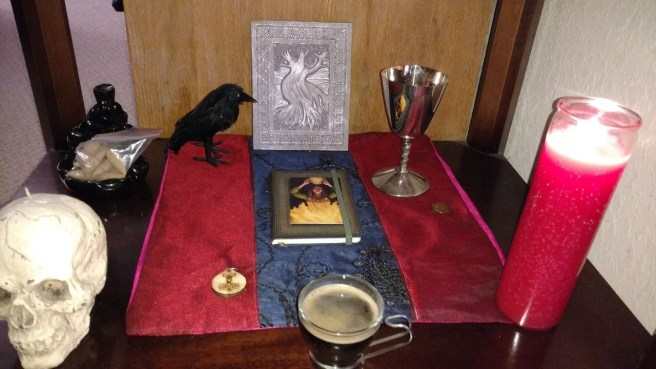 A photo of my altar setup. I made an offering of black tea and fruit-filled biscuits for Hela and Loki today (the tea doesn’t look black, in the photo, I know).