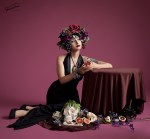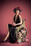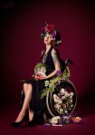 [image desc: 5 images of me, a nonbinary indian wheelchair user wearing a flower headdress, claw necklace, and black dress surrounded by flowers, skulls, and fruits. (1) me sitting in my wheelchair looking off into the distance (2) me laying down surrounded by moss, flowers, bones and fruit (3) me holding a pomegranate looking at the camera (4) me sitting on the floor with my arm resting on a draped stool (5) me in my wheelchair holding a skull and pomegranate]